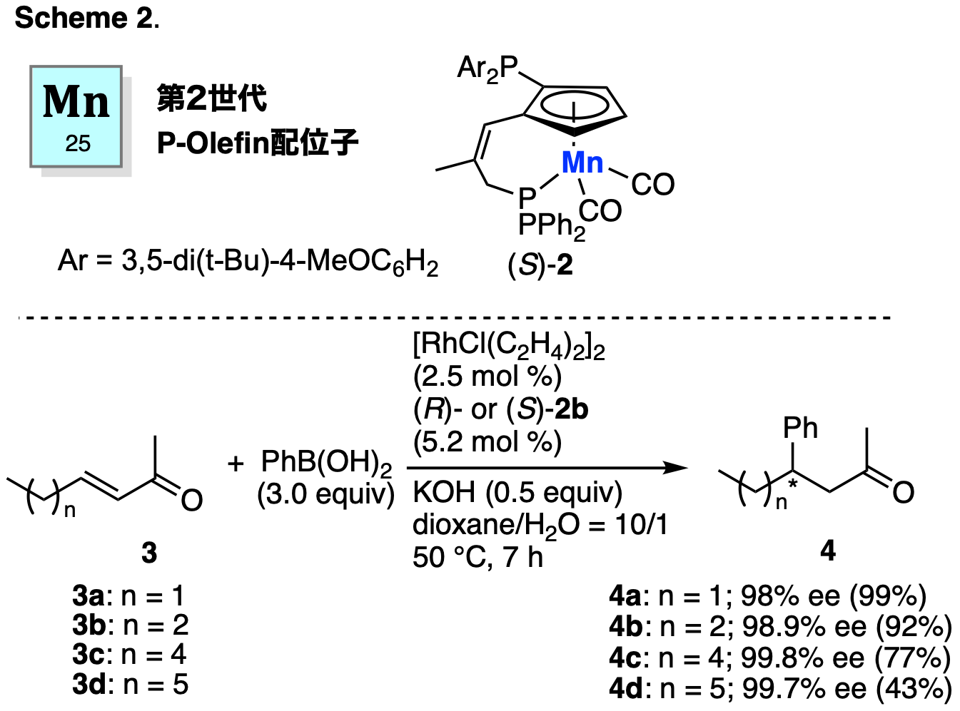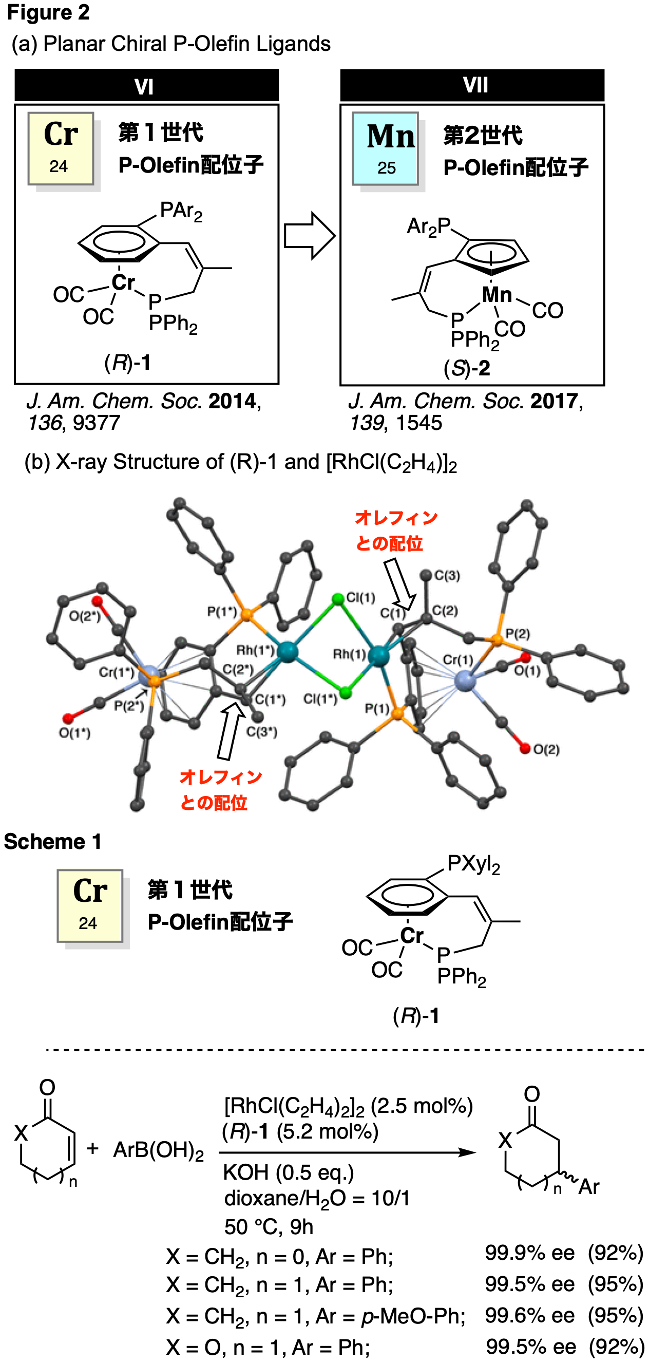 我々は、面不斉アレーンクロム錯体の触媒的合成法における一連の研究の過程で、アレーンクロム錯体を基盤とする面不斉配位子(R)-1を期せずして開発することに成功した。また、配位子(R)-1の構造上の特徴として、アレーン上のホスフィンとオレフィンとで、遷移金属に配位するホスフィンーオレフィン二座配位子として、機能することをX線結晶解析の結果より、明らかにしている。この配位子 (R)-1は、Rh触媒不斉1,4-付加反応において、環状エノンに対して、非常に高い反応性、及び立体選択性を示すことがわかった (JACS, 2014, 136, 9377)。一方、鎖状エノンに対しては、反応性および立体選択性ともに低く、その基質適用範囲は狭さが問題となっていた。また配位子の堅牢性においても問題があった。そこで、これらの問題点を解決すべく、さらなる配位子の改善に取り組み、面不斉Cpマンガン錯体を基盤とする第二世代型ホスフィンーオレフィン配位子(S)-2の開発を行った (JACS, 2014, 136, 9377)。