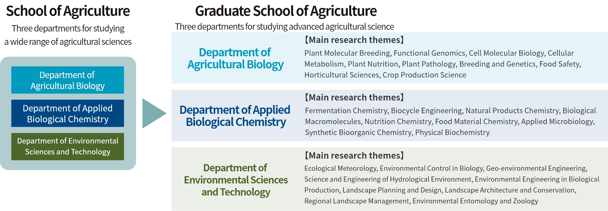 Several minors are provided, including Minor in Food Safety Management through collaboration between the Department of Agricultural Biology and the School of Veterinary Science, Minor in Plant Factory Science, through collaboration between the Department of Agricultural Biology, the Department of Environmental Sciences and Technology, and the School of Engineering, and Minor in Drug Discovery Sciences and Technology, a university-wide program that is mainly undertaken by the Department of Applied Biological Chemistry.