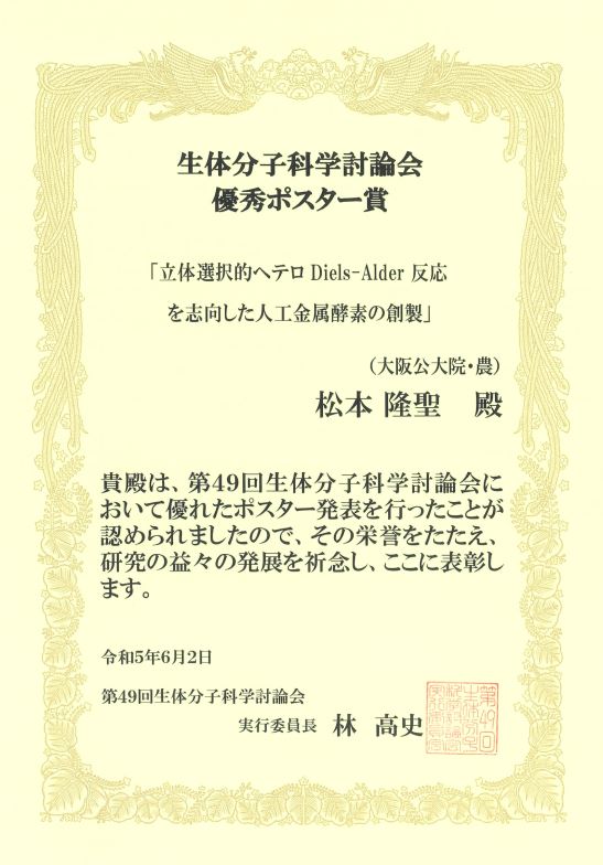 M2の 松本隆聖さんが優秀ポスター賞を受賞しました!おめでとう!!
