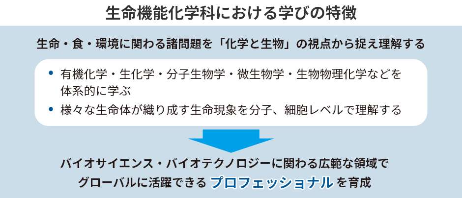 生命機能化学科は、日本独自の進化を遂げてきた農芸化学にルーツを持ち、バイオを「化学と生物」の視点から理解し、得られた知見を基盤としてイノベーションを生み出すことを目的とした研究・教育を行います。動物・微生物・植物が織り成す生命現象を分子、細胞レベルで理解し、人類社会の発展に生かすために必要な最先端の生化学・分子生物学・有機化学・微生物学・生物物理化学などを体系的に学びます。そして、食品産業や医薬品工業、化学工業、環境・資源・エネルギー産業、食品安全行政などバイオサイエンス・バイオテクノロジーに関わる広範な領域で、グローバルに活躍できる次世代の専門職業人を育成します。