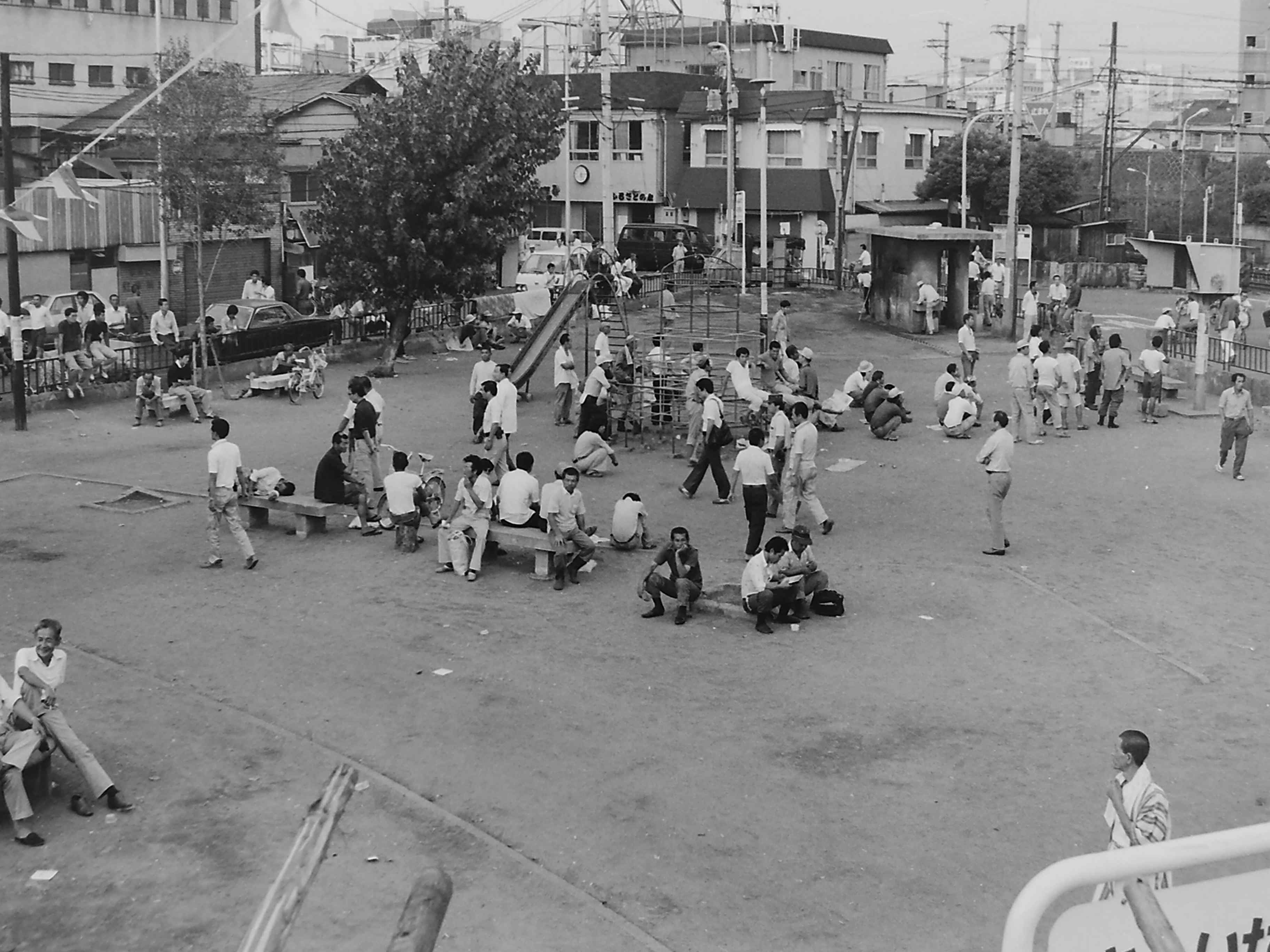 日本一の日雇い労働者街である釜ヶ崎にある通称「三角公園」(正式には「萩之茶屋南公園」)でくつろぐ人びとの姿をとらえたものです。夏には盆踊りなどが開かれて、憩いのひと時を提供する場所となっています。右上には、街頭テレビが写っています。 |