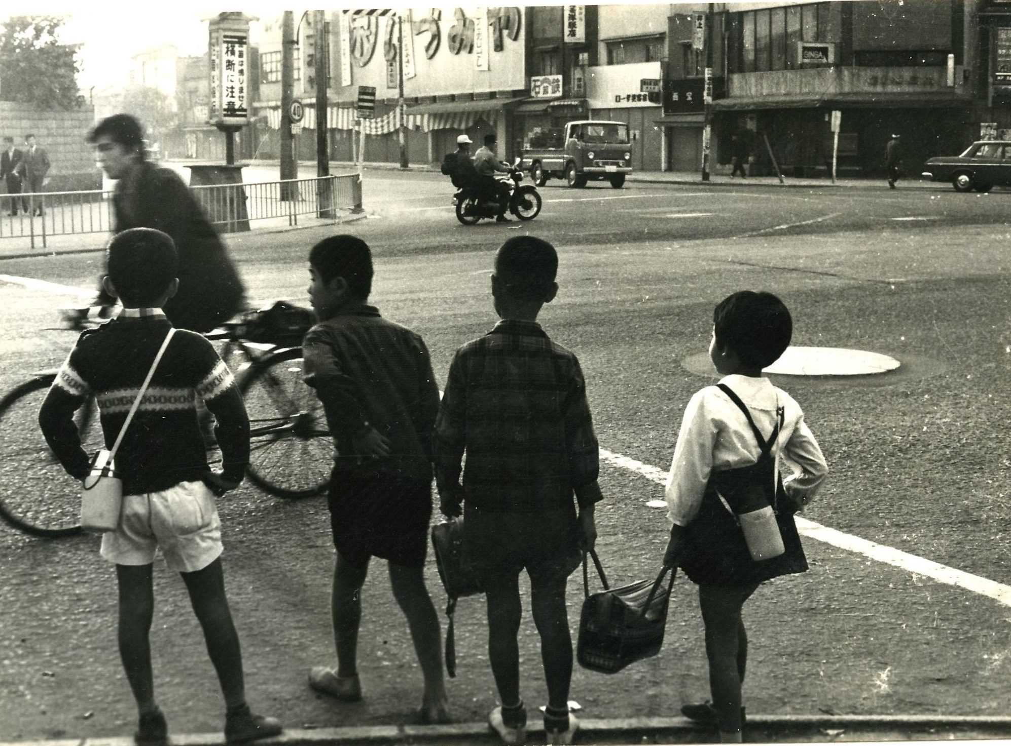 高度経済成長期の花園町交差点です。北西側から南東側を写したもので、右手には「いづみや」(現・イズミヤ)の看板が見えます。左手上の石積みの塀は、弘治小学校のものです。子どもの服装や持ち物、交差点を行き交う車やバイクが往時をしのばせます。 |