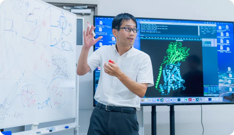 異なる専門分野の教員で構成される研究科の特徴を生かした「異分野創薬ラボ体験プログラム」や多様な特論講義等を通して、多様な専門領域を有機的に連携させた“総合知による創薬“を実践する。