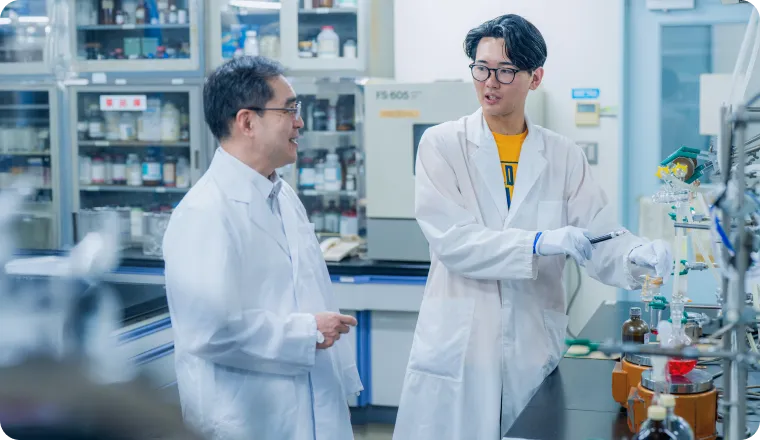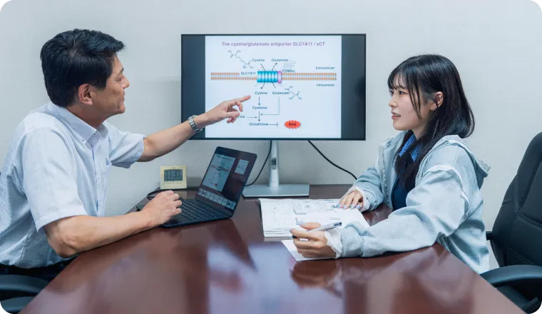 異なる専門分野の教員で構成される研究科の特徴を生かした「異分野創薬ラボ体験プログラム」や多様な特論講義等を通して、多様な専門領域を有機的に連携させた“総合知による創薬“を実践する。
