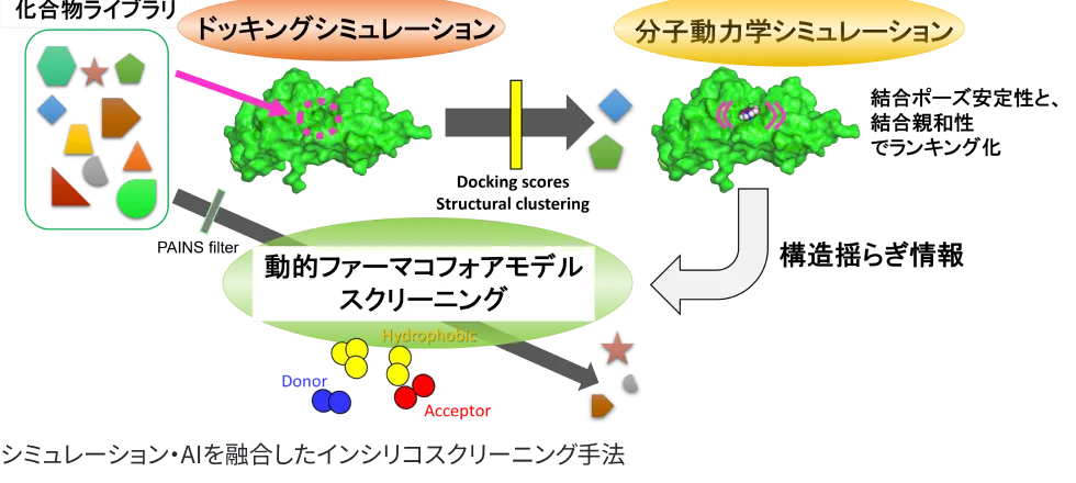 インシリコ創薬への応用森次 圭 教授 [ 理学部 生物化学科 ]スーパーコンピュータといった大規模な計算資源の活用により、タンパク質の機能に関わるような大きな構造変化を効率的に捉える新たなシミュレーション手法を開発します。また、構造揺らぎや自由エネルギー計算を考慮した分子スクリーニング法をAIと組み合わせて高度化することで、結合様式の予測精度を高め、より効果的な薬剤設計(インシリコ創薬)への応用を図ります。