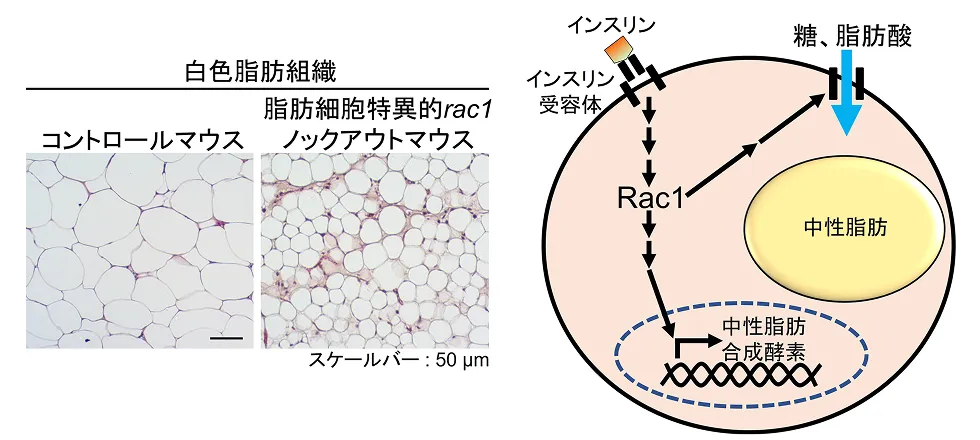 とくに、Rac1と呼ばれるGTPアーゼが、骨格筋と脂肪細胞でのインスリン応答や白色脂肪細胞の肥大化を制御していることを見出し、その調節機構の解明を目指している。また、脂肪細胞特異的なRac1の欠損が、骨格筋や肝臓などの臓器に及ぼす影響も解析している。