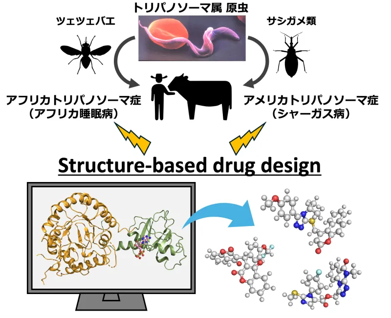 新規治療薬の開発乾 隆 教授 [ 農学部 生命機能化学科 ]トリパノソーマ症は、原虫トリパノソーマ属によって引き起こされる人獣共通感染症である。その代表例であるアフリカ睡眠病やシャーガス病に対しては、現状いくつかの治療薬が用いられているが、強い副作用を示すなど満足できる性能には達していない。当研究室では、トリパノソーマ原虫の生育に重要な酵素(プリン核酸サルベージ経路で働く酵素)に着目し、酵素化学的・構造生物学的な知見から、副作用の少ない治療薬の開発を目指し研究を行っている。