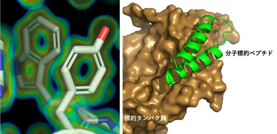 バイオ医薬品開発に関する研究道上 雅孝 講師 [ 理学部 生物化学科 ] //中瀬 生彦 教授 [ 理学部 生物化学科 ]近年、タンパク質を有効成分とするバイオ医薬品が注目されていますが、巨大で複雑な立体構造をもつため、細胞内分子を標的にできないなどの課題があります。当研究室では、より小型の「ペプチド」を用いた次世代バイオ医薬品を開発しており、独自に設計した分子標的ペプチドは従来のバイオ医薬品の機能を維持しながら約50分の1に小型化され、細胞内標的への応用拡大に向けた研究を進めています。