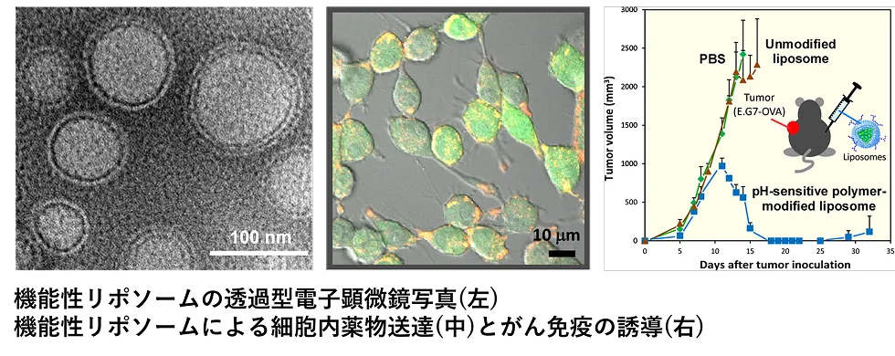 機能性高分子や機能性リポソームの開発弓場 英司 准教授 [ 工学部 化学バイオ工学科 ]私たちは「化学でくすりと免疫をengineeringする」をキーワードに、生体内、特に免疫系で機能発現するバイオマテリアルを創製することにより、化学を基にしたがん・免疫関連疾患治療技術の創出に関する研究に取り組んでいます。例えば、細胞内に効果的にタンパク質を運搬できる機能性リポソームにより、担がんマウスにおいて強力ながん免疫を誘導できることが示されています。