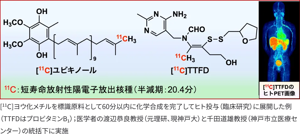 創薬化学に関する研究土居 久志 特任教授 [ 理学部 生物化学科 ]創薬の概念実証に有効な生体イメージング法として、放射性PETイメージング、超偏極MRIイメージング、および、近赤外光イメージングの化学標識法を創出します。PET研究においては、これまでに炭素−炭素結合による実用的11C-メチル標識法を開発してきました。今後は、低分子に加えて、核酸医薬や抗体医薬に対する化学標識法にも挑みます。最終目標として、セラノスティクス(診断と治療)への展開を図ります。