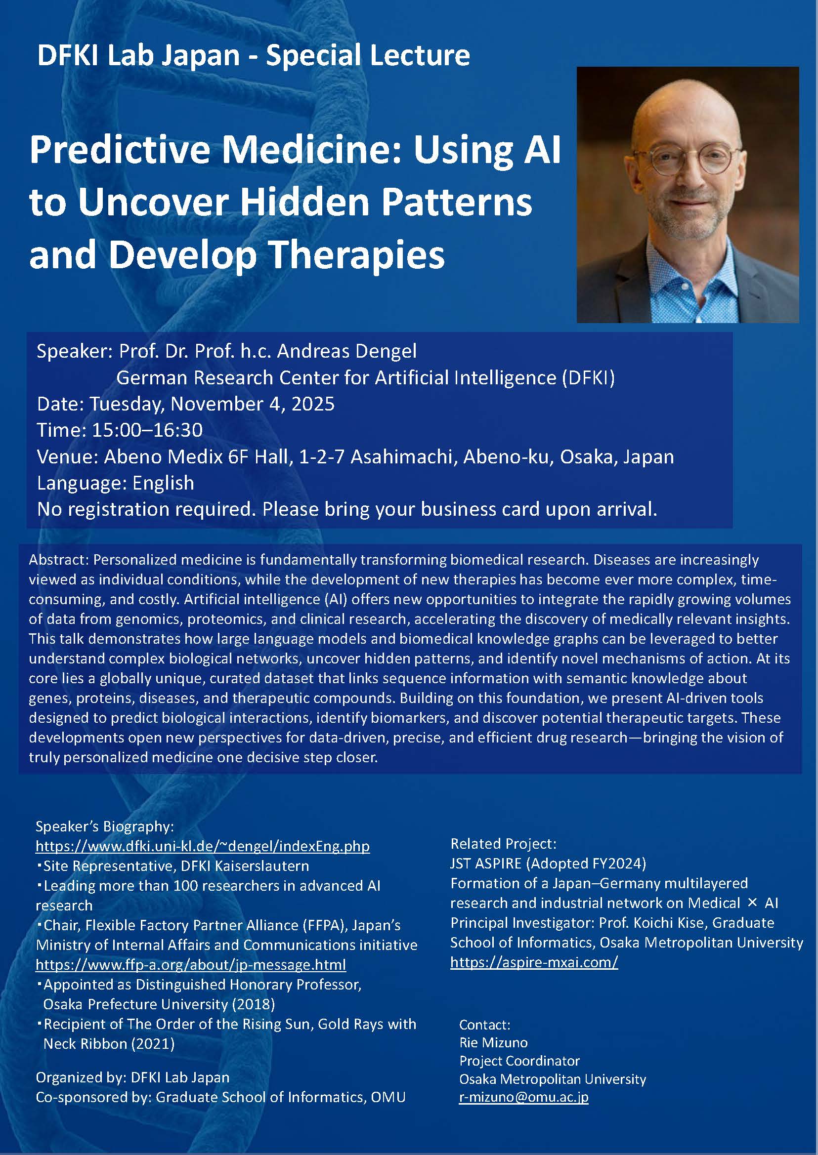 Professor Andreas Dengel from the German Research Center for Artificial Intelligence (DFKI) will deliver a special lecture on Abeno Campus. The lecture will present how AI technologies, including large language models and biomedical knowledge graphs, can integrate genomic, proteomic, and clinical data to analyze biological networks and uncover hidden patterns. Professor Dengel will also discuss how these AI-driven tools predict biological interactions, identify biomarkers, discover therapeutic targets, and accelerate personalized medicine and efficient drug research.