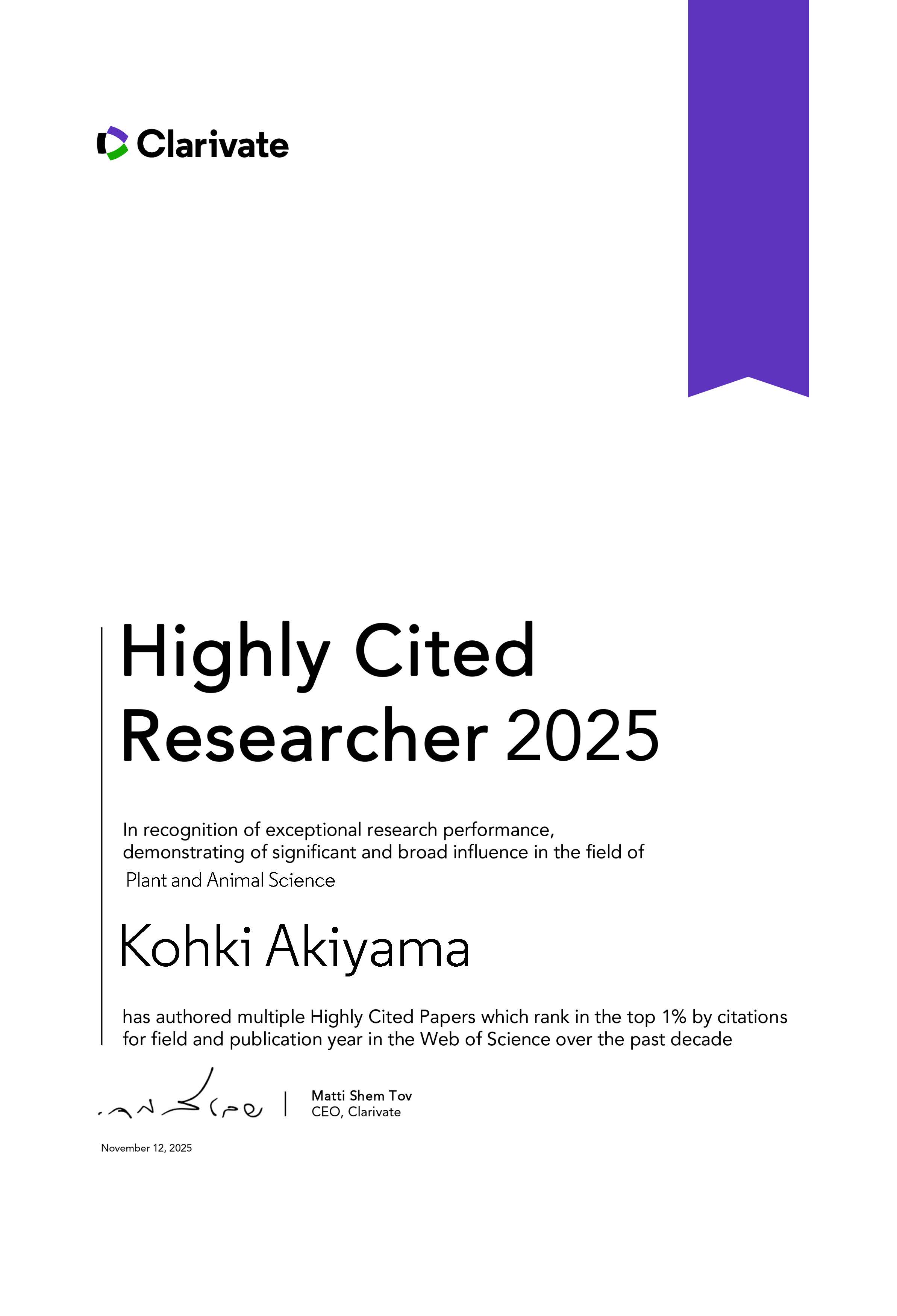 Professor Kohki Akiyama from the Graduate School of Agriculture has been selected for the Clarivate’s 2025 list of Highly Cited Researchers for the second consecutive year.