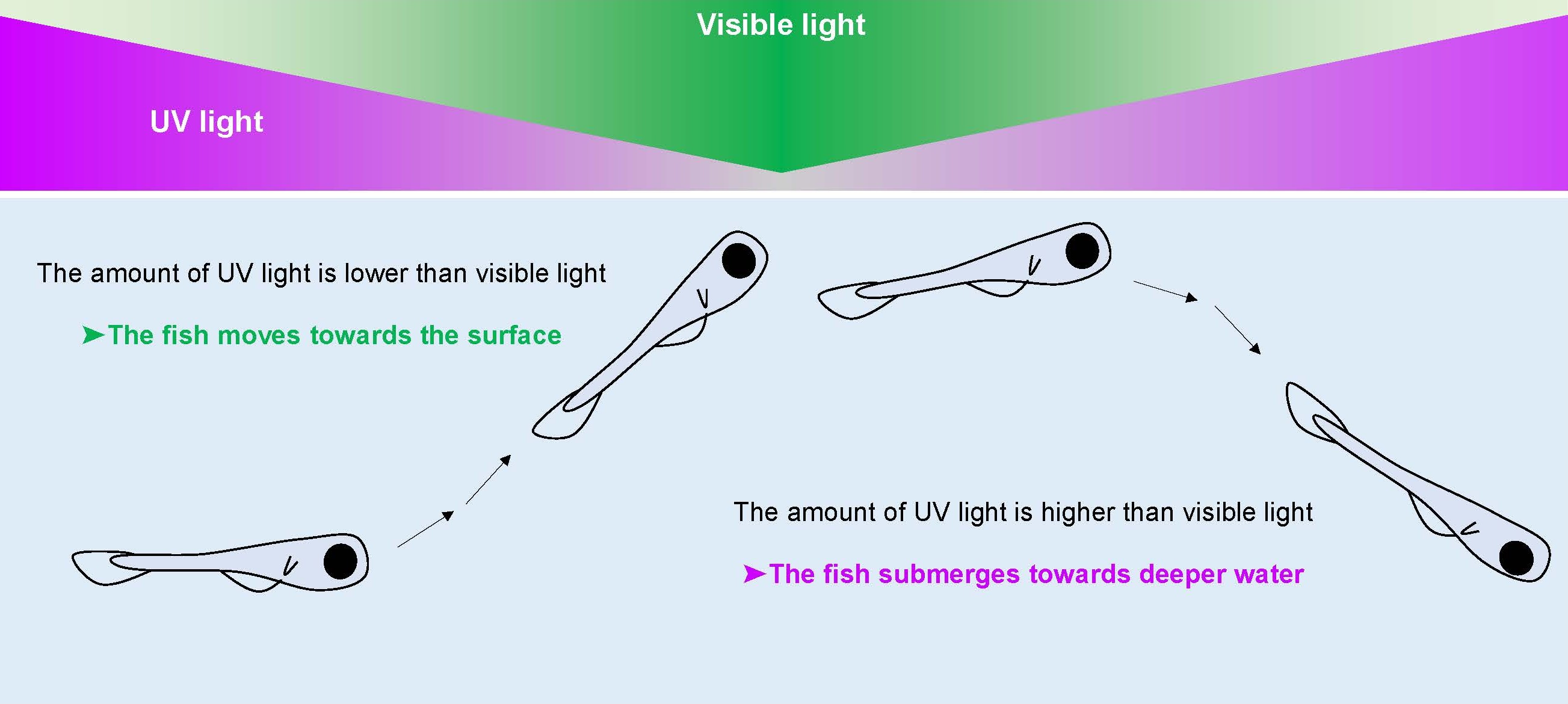 Fish change their swimming direction in response to differences in the wavelength of light: when ultraviolet light is weak, they swim toward the surface, whereas when it is strong, they swim downward.