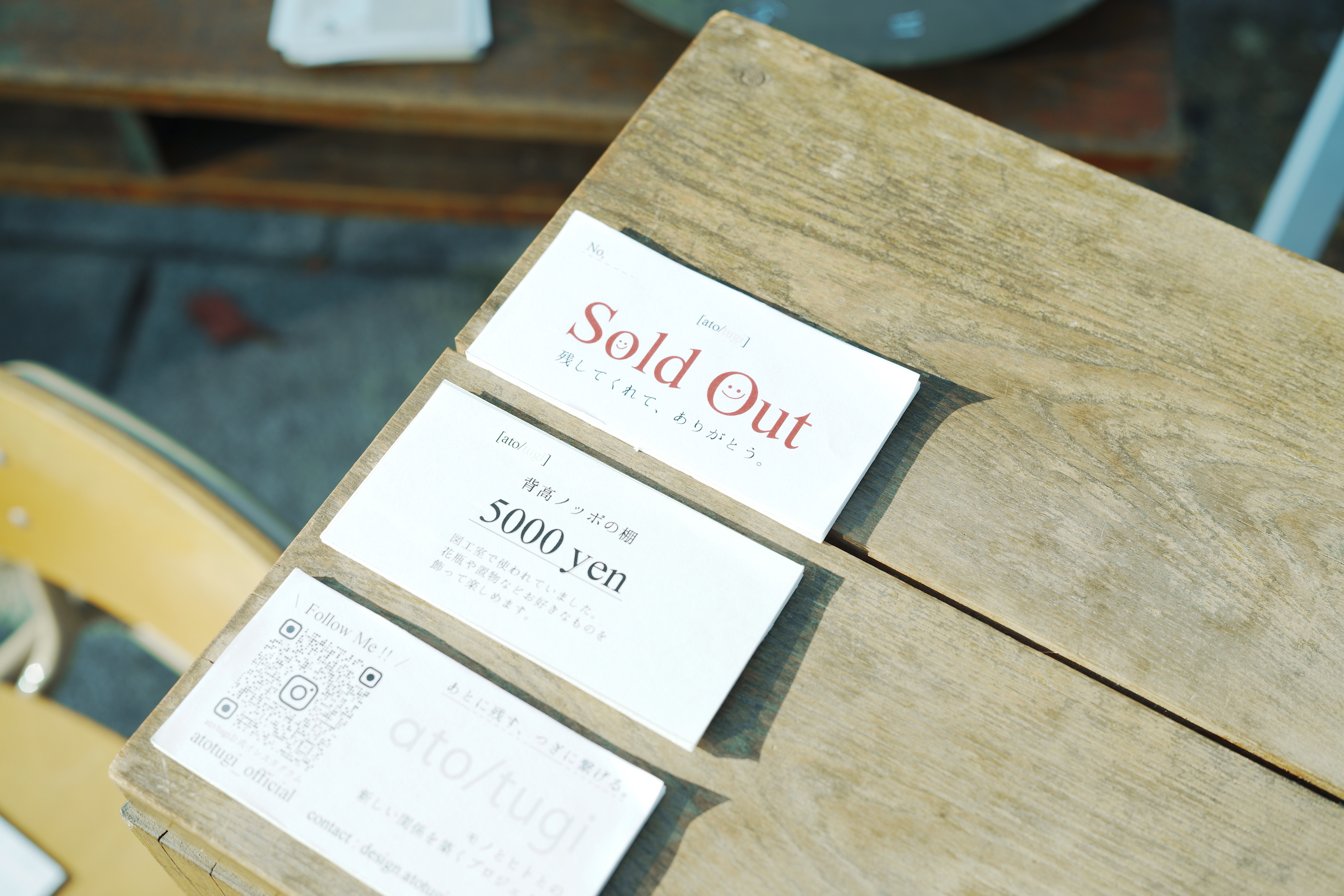 ただ家具を販売するだけでなく、“ato/tugi”のコンセプトでもある「あとに残し、つぎに繋げよう。」という想いを伝えることができた3日間となりました。