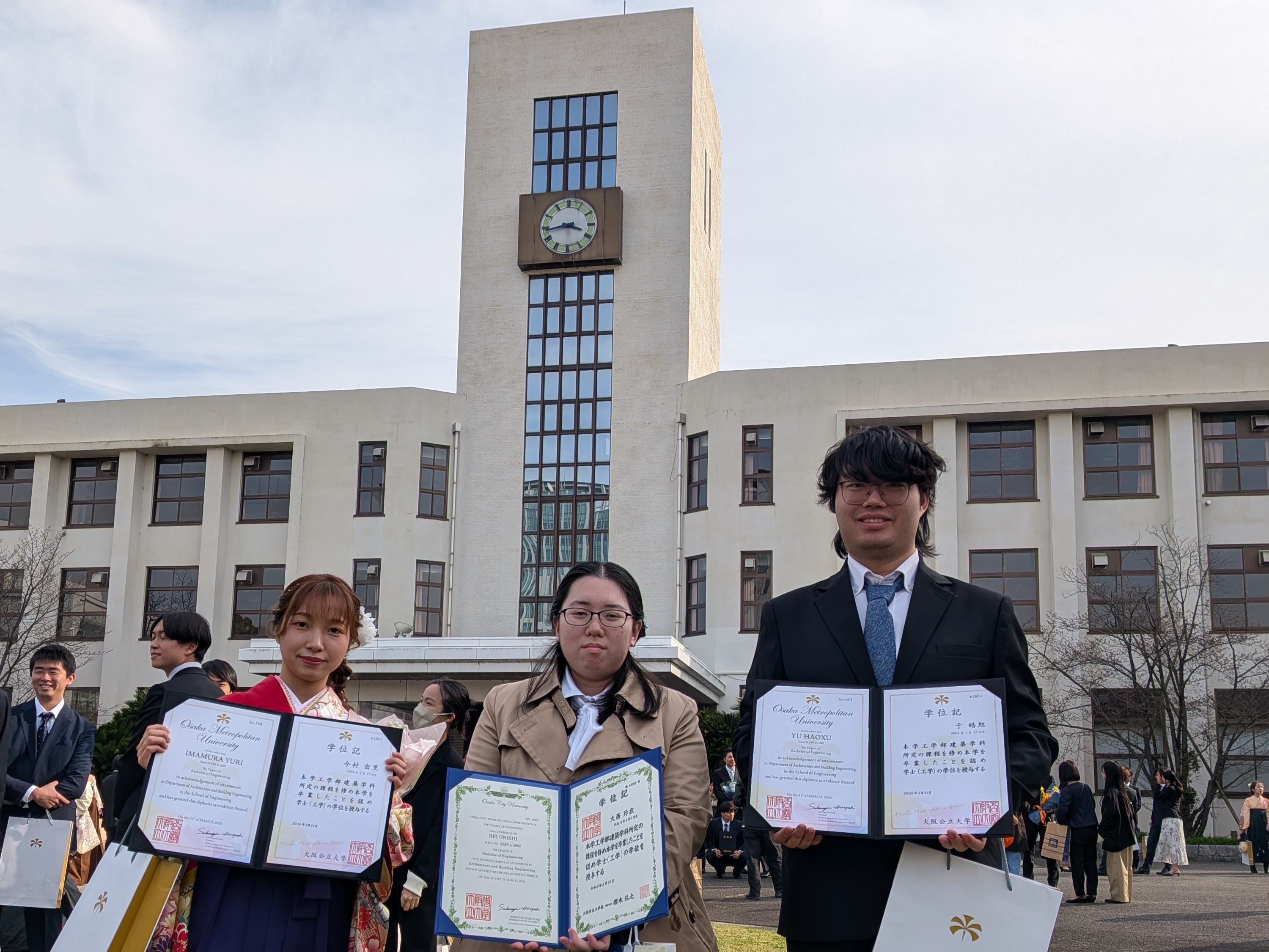 2026年3月24日に本学の学位授与式が行われ,本研究室からは3名の学生に学士の学位が授与されました。また,本研究室の今村由里さんが建築学科賞(論文部門)と空気調和・衛生工学会振興賞学生賞を受賞しました。