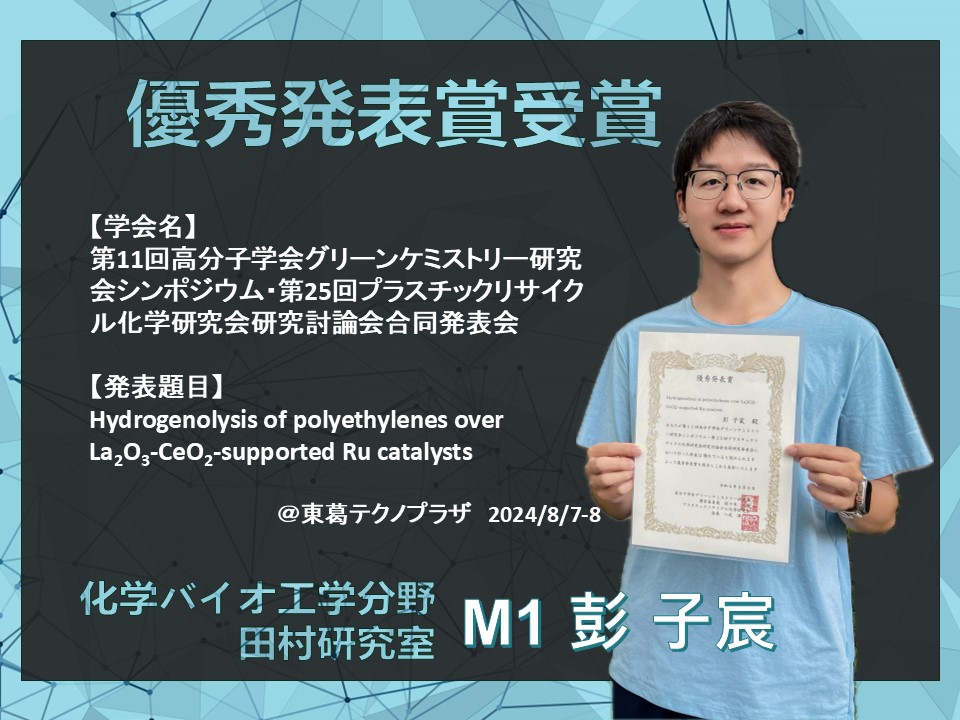 博士前期課程1年 彭 子宸さんが、第11回高分子学会グリーンケミストリー研究会シンポジウム第25回プラスチックリサイクル化学研究会研究討論会合同発表会において、優秀発表賞を受賞しました。