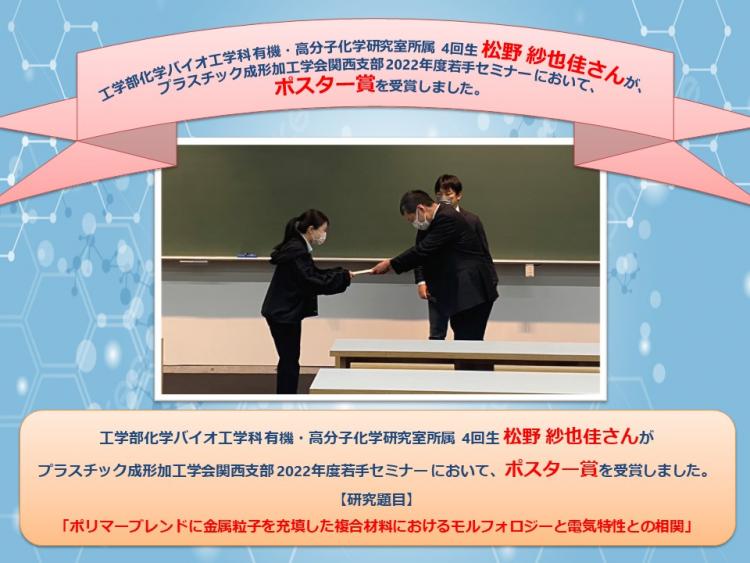 有機・高分子化学研究室所属4回生 松野 紗也佳さんが、プラスチック成形加工学会関西支部2022年度若手セミナーにおいてポスター賞を受賞しました。