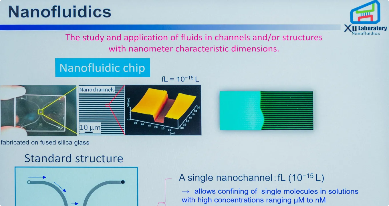 At our laboratory, we conduct research using our uniquely developed "nanofluidic devices" to revolutionize the fields of chemistry, chemical engineering, biology, and materials science. A nanofluidic device is a small glass chip, only a few centimeters in size, with nano-scale fluidic channels (nanochannels) etched into it. This device is gaining attention as an ultra-small fluidic experiment environment.