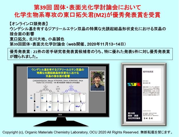 東口 拓矢君(M2)が第39回固体・表面光化学討論会において、優秀発表賞を受賞しました