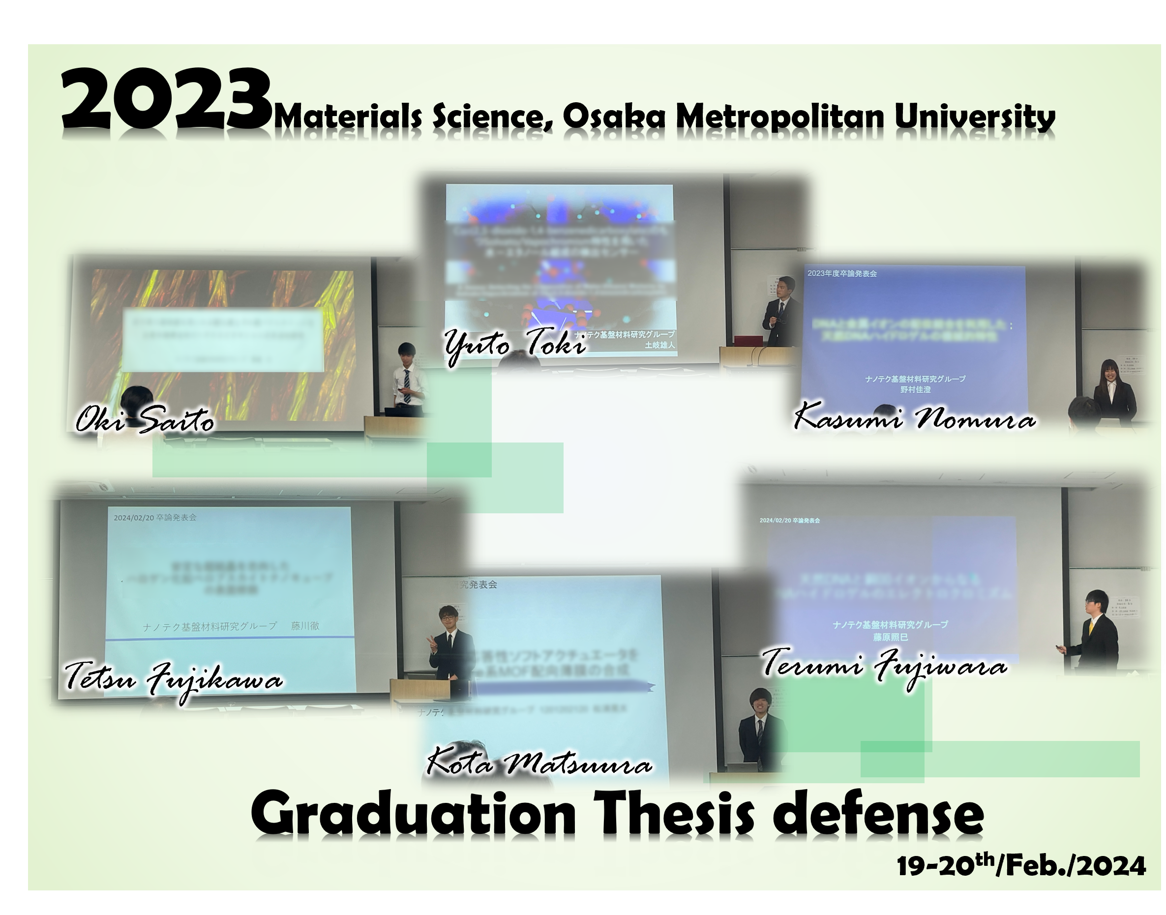 2024年2月19-20日にマテリアル工学分野の卒業論文発表会が行われました。 当研究グループから6名の学生(B4 齋藤大くん、土岐雄人くん、野村佳澄さん、藤川徹くん、藤原照巳くん、松浦晃太くん)が自身のテーマについて研究成果をプレゼンしました。