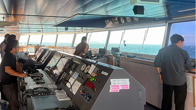 2024年11月30日、本研究室で開発した遠隔監視・操船システムを全長158mの実船に搭載し、瀬戸内海にて実証実験を行いました。