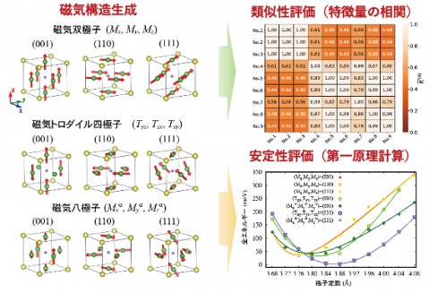 In many antiferromagnets, a highly symmetric magnetic structure is realized. In our research, we have shown that highly symmetric magnetic structures can be automatically generated for a given crystal structure by utilizing the multipole theory and group theory. We have shown that these theories can be combined with first-principles calculations to predict stable magnetic structures without the use of experimental information, and we are now working on the prediction of physical properties through simulations of magnetic structures. We are also engaged in research on physical properties using machine learning, a statistical analysis method that is the basis of artificial intelligence, and have proposed theoretical methods for converting magnetic structures into machine learning features.