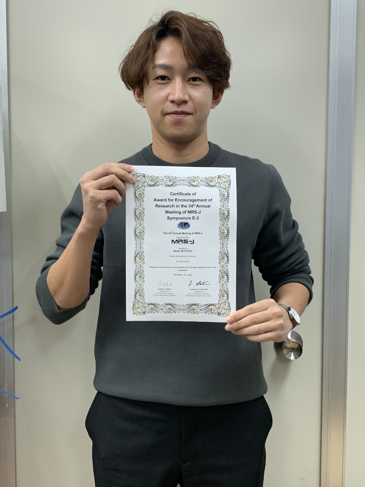 2024年12月17日~19日に開催された 34th Annual Meeting of MRS-Japan において、工学研究科 量子放射線系専攻 量子放射線工学分野(量子線エネルギー反応科学G) 博士前期課程2年 世山将大さん が Award for Encouragement of Research を受賞しました。