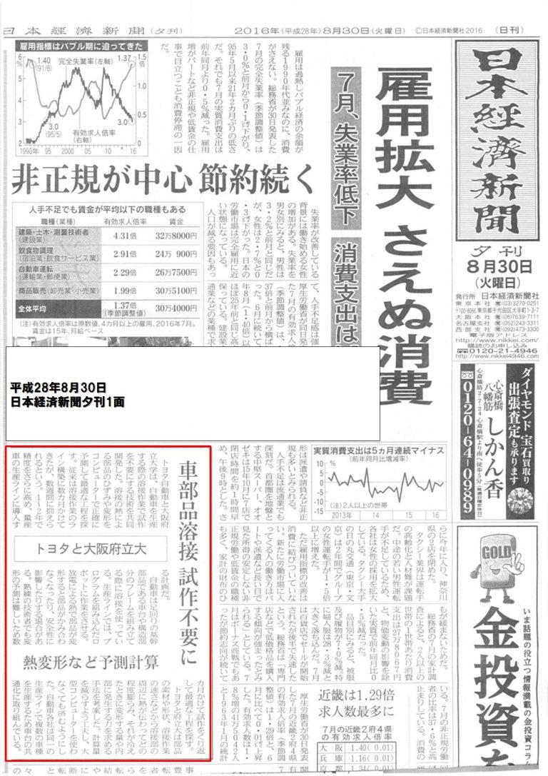 柴原研究室とトヨタ自動車との共同研究成果により、車部品溶接が将来的に試作不要になるという内容の記事が、日本経済新聞夕刊一面に掲載されました。