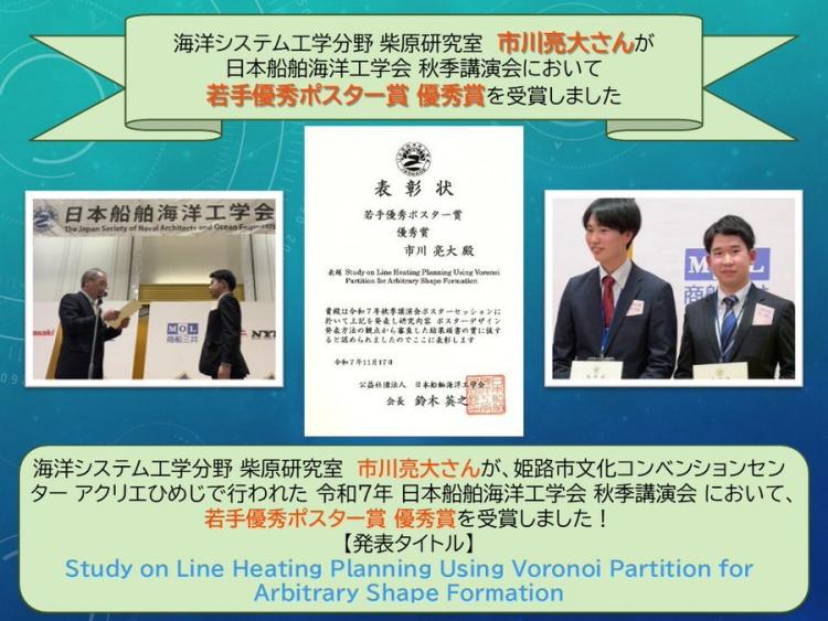 受賞:柴原研究室 M2 市川亮大さんと M2 山邉晃瑠 さんが、11月11日、12日に行われた日本船舶海洋工学会秋季講演会 ポスターセッションにおいて、「若手優秀ポスター賞 優秀賞」を受賞しました!