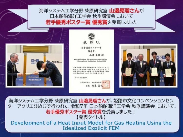 報告:柴原研究室 山邉晃瑠さんが、日本船舶海洋工学会 関西支部 学生研究発表会2025 において、支部長賞(奨励)を受賞した旨が、工学研究科HPおよびXに掲載されました。