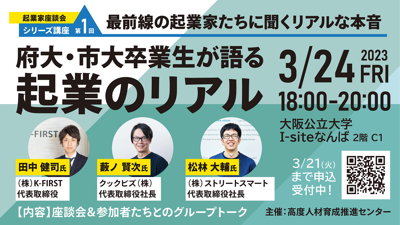 第1回では、活躍している大阪府立大学・大阪市立大学出身の起業家をお迎えして、起業の実態を伺います。