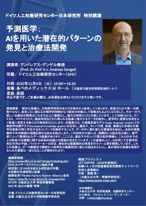 2025年11月4日(火)にドイツ人工知能研究センター(DFKI)のAndreas Dengel教授をお招きし、あべのメディックス6Fホールにて、専門分野の「予測医学:AIを用いた潜在的パターンの発見と治療法開発」に関する研究内容についてご講演いただきます。事前申込不要で、誰でもご参加頂けます。