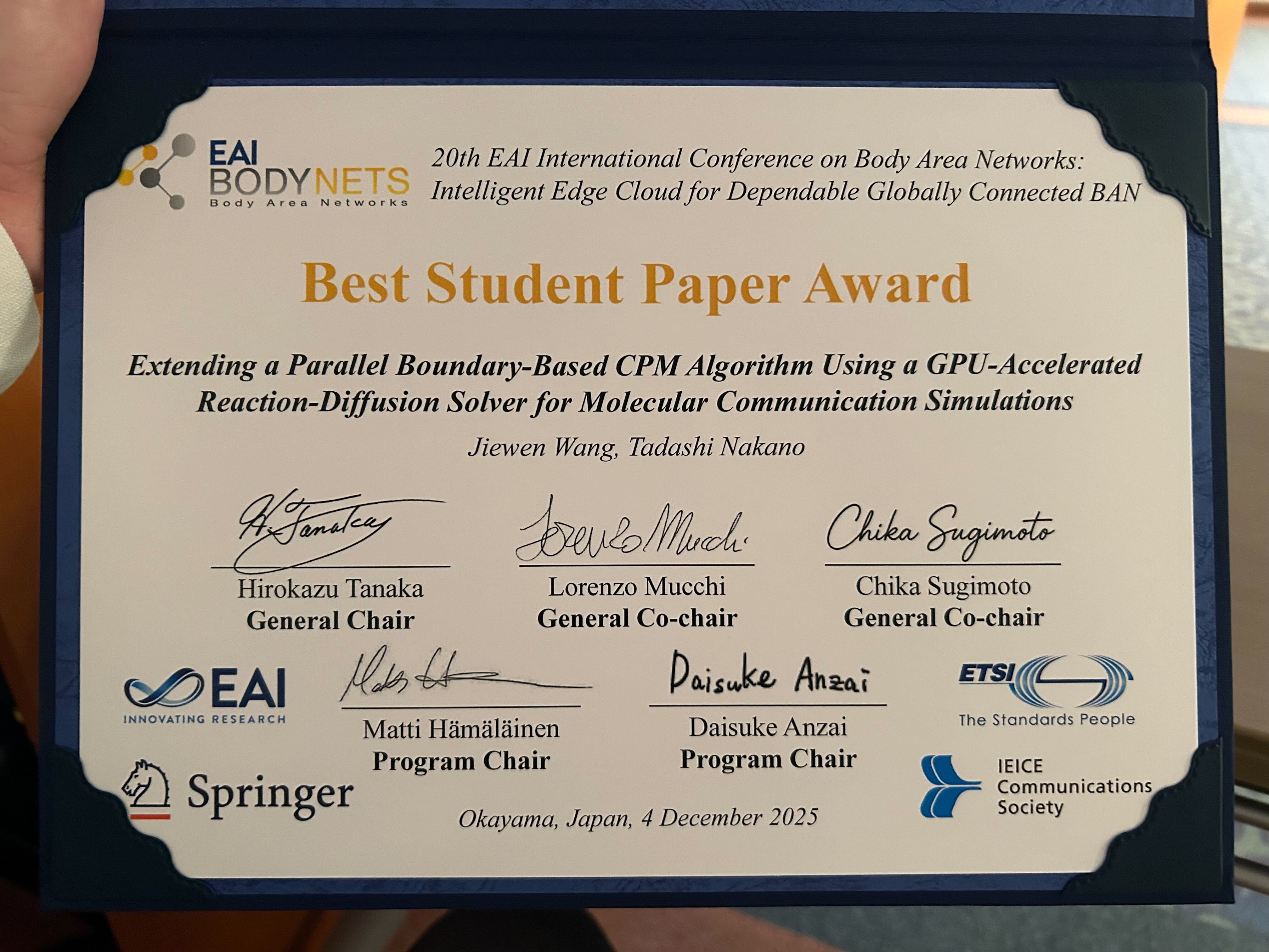 2025年12月2日から4日にかけて岡山コンベンションセンター(岡山県岡山市)で開催されたEAI BodyNets 2025において、情報学研究科基幹情報学専攻博士後期課程2年生の王潔文さん(指導教員:中野賢教授)が主著を務めた論文がBest Student Paper Awardに選出されました。本賞は、学生が主著の論文において最も高い評価を受けた論文に授与される賞です。