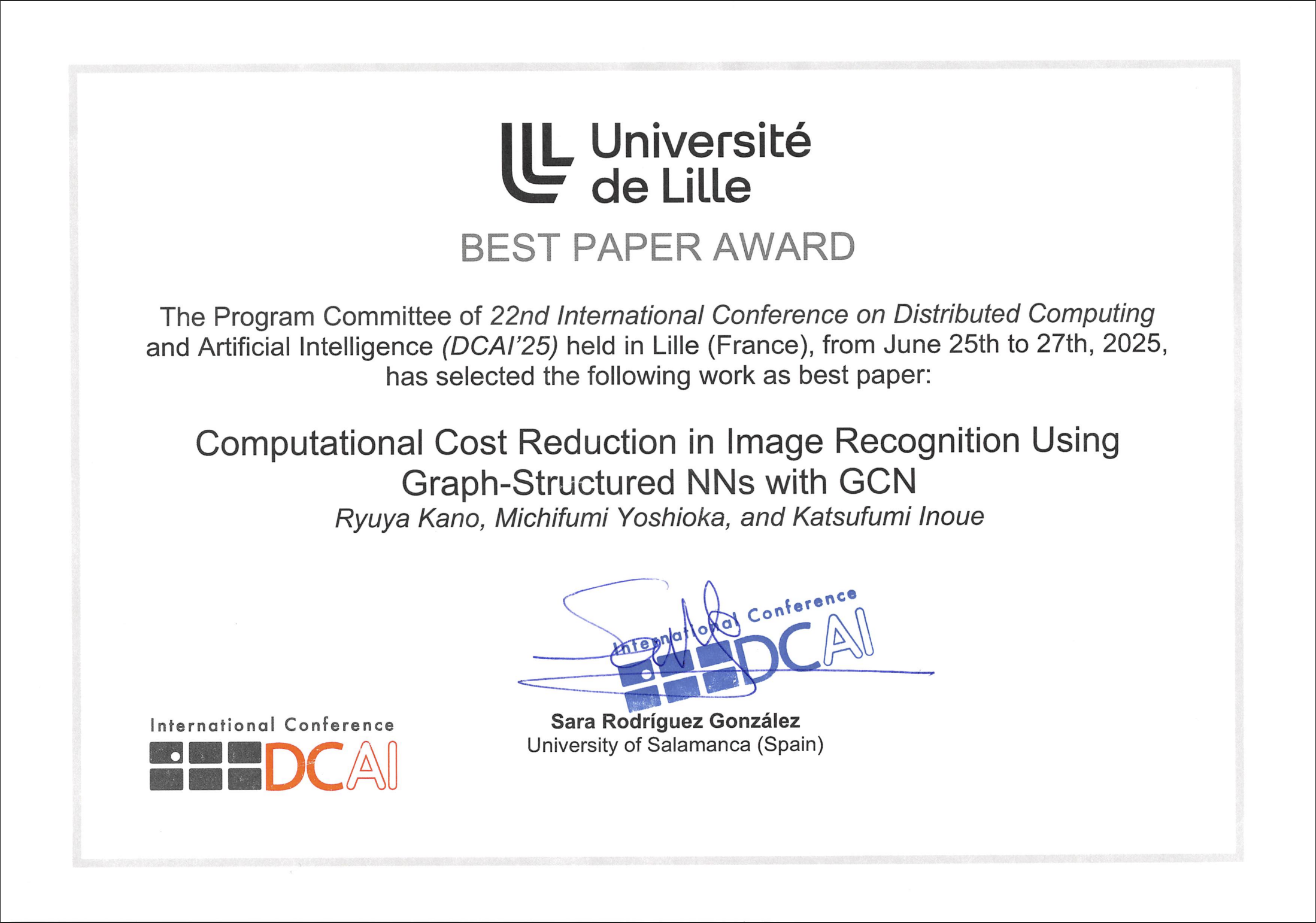 2025年6月25日~27日にフランス・リールで開催された国際会議DCAI’25: 22nd International Conference on Distributed Computing and Artificial Intelligenceにおいて,基幹情報学専攻博士前期課程1年の狩野龍哉さん(指導教員:吉岡理文教授)がBest Paper Awardを受賞しました.
