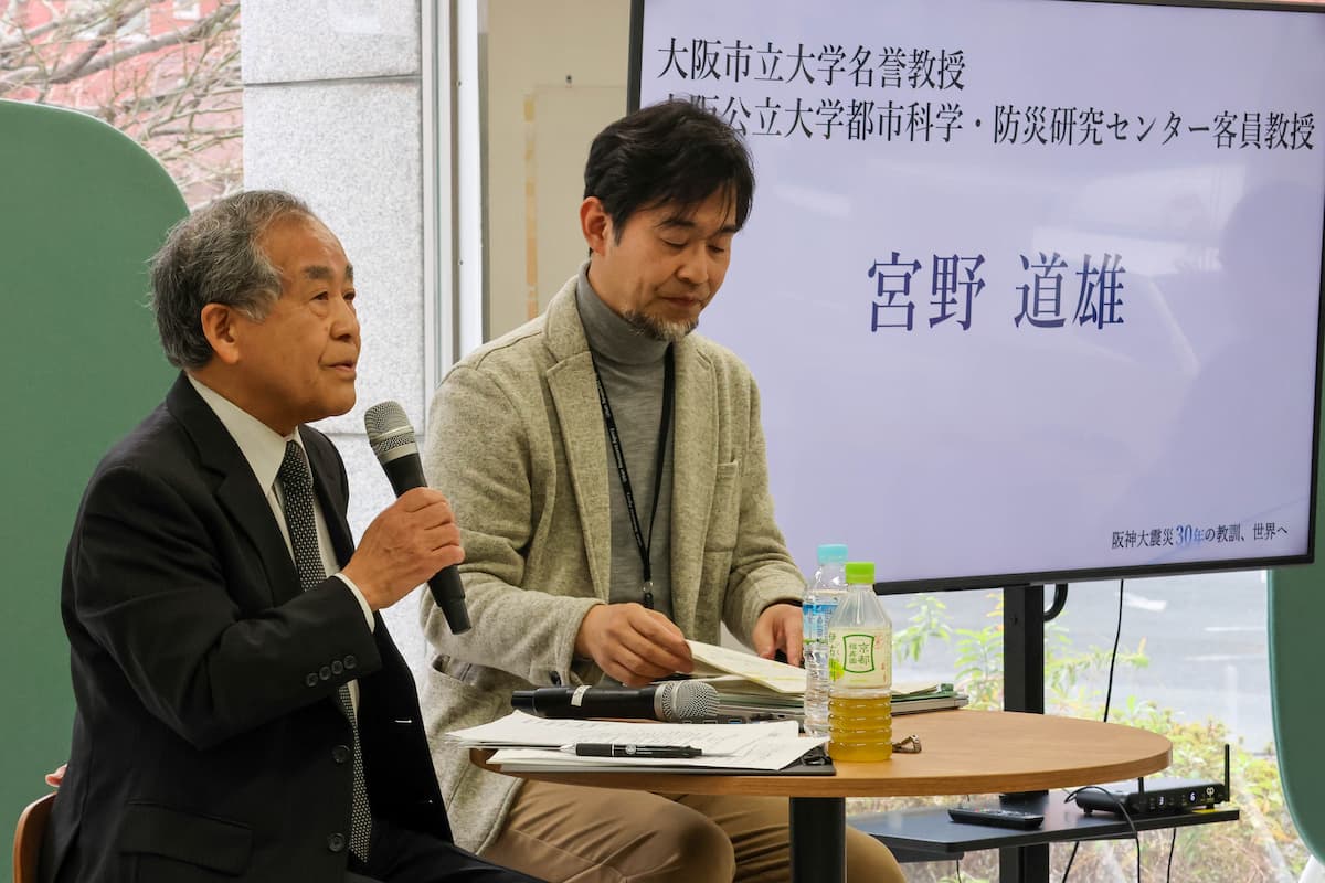 - 防災対策の転換点(本学 宮野 道雄客員教授):阪神大震災を機に日本の防災がハード重視から、生活復興や共助を含むソフト面の強化へと大きく転換したことなどを解説しました。
