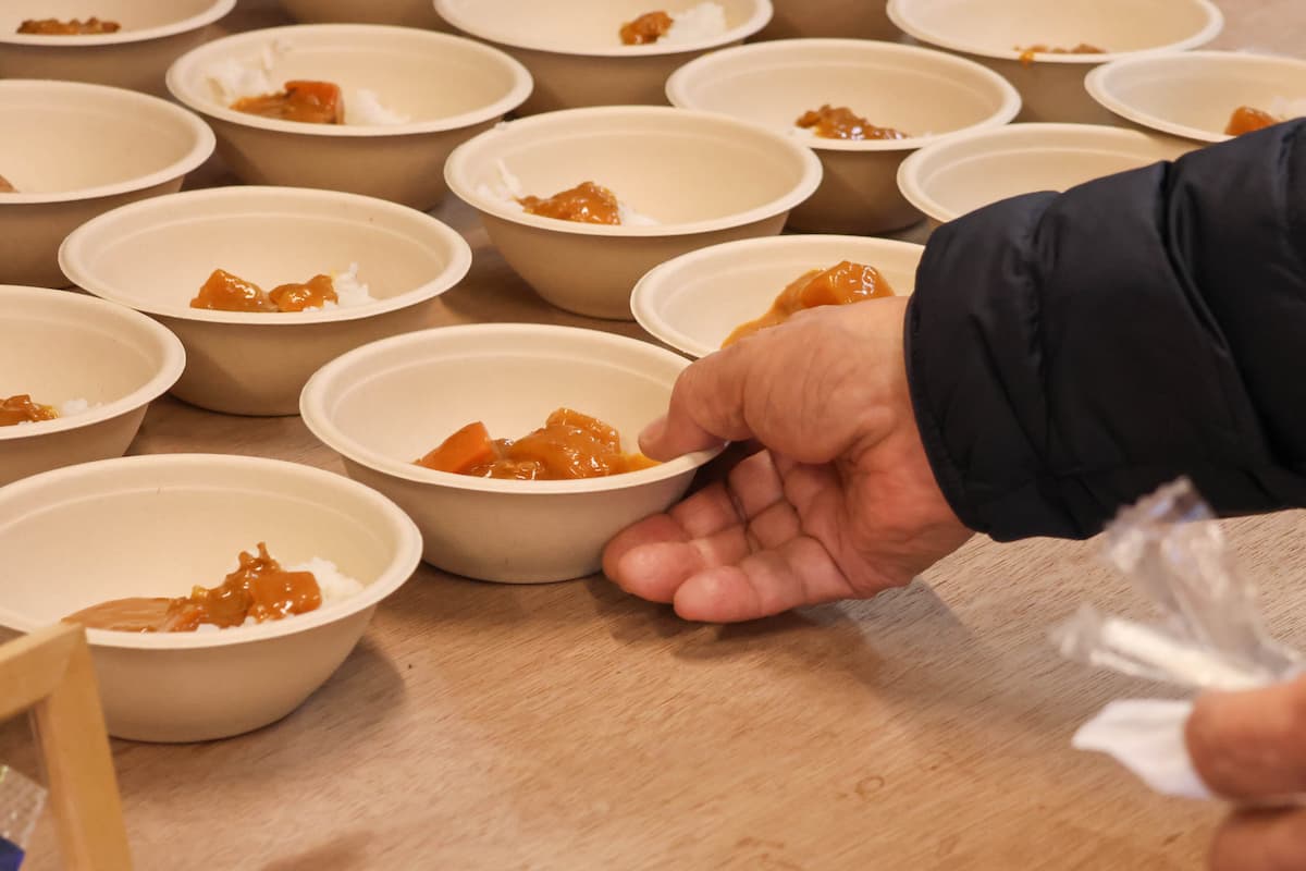 イベントの最後には、本学生活科学部の学生らが開発したプラントベース(植物性原料のみ)のレトルトカレー「ひとさらのミライ」の試食会が行われました。このカレーは、アレルギーや宗教的背景に関わらず「誰もが一緒に食べられる」ことを目指しており、災害時の備蓄食としての活用も期待されています。参加者はカレーを食べながら登壇者らと交流し、地域コミュニティを支えるつながりの大切さを再確認しました。
