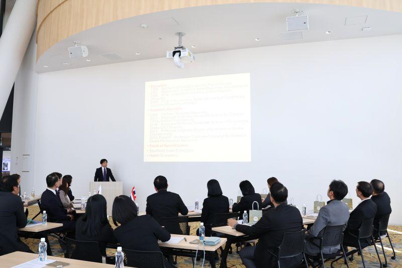 本学からは髙橋 雅英国際交流担当副学長をはじめ、タイとの学術交流において中心的な役割を担ってきた金子 勝規経済学研究科教授、永井 史男法学研究科教授が出席。また、継続的にSWUと協力関係を築いてきた看護学研究科からは、中山 美由紀研究科長、横山 美江教授も同席し、訪問団一行を温かく迎えました。