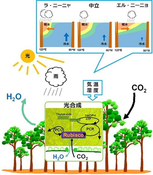 東京大学大学院農学生命科学研究科の熊谷朝臣教授、羽田泰彬特任研究員、高村直也大学院生は、琉球大学の松本一穂准教授、九州大学の久米朋宣教授、大阪公立大学の植山雅仁准教授と共同で、ボルネオ熱帯雨林において、いくつかのエル・ニーニョとラ・ニーニャ(注1、図1)を含む10年間のフィールド観測と観測データに基づくコンピュータシミュレーションを行い、森林単位の二酸化炭素吸収速度がラ・ニーニャ時で大きくなりエル・ニーニョ時で小さくなること、そしてそれは、光合成能力(カルビン・ベンソン回路の最大炭酸固定反応速度(注2、図1))がラ・ニーニャ時で大きくなりエル・ニーニョ時で小さくなることが原因であると突き止めました。