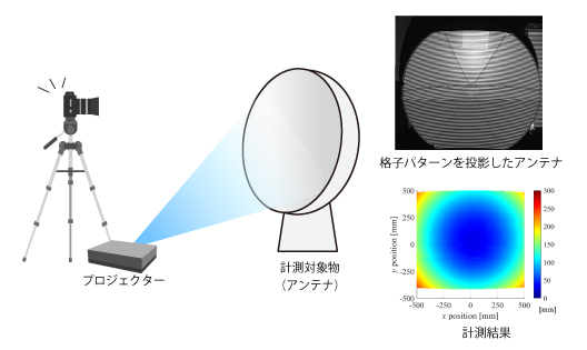 格子投影法は対象物の表面形状を計測する手法の一つで、プロジェクターから対象物の表面に格子パターンを投影し、それをカメラで撮影することで3次元的な形状を計測できます(図1)。この手法では、撮影した画像の画素ごとの明るさを用いて計測を行うため、画素数が大きいほど(解像度が高いほど)高精度な計測が可能です。しかし、宇宙空間でアンテナ等の大型構造物を計測する場合、膨大な撮影データを処理する必要があり計算コストもかかるため、対象物ごとに求められる計測精度を維持できる最適な解像度を探すことが必要です。