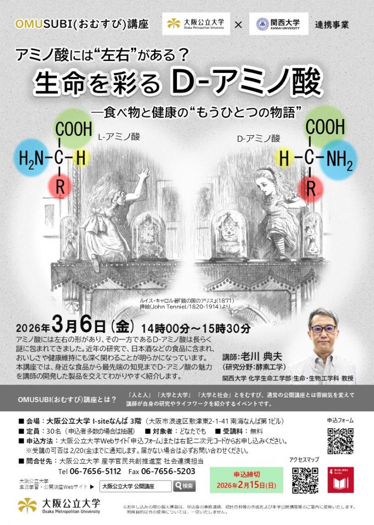 3月6日(金) OMUSUBI講座「アミノ酸には“左右”がある?生命を彩るD-アミノ酸―食べ物と健康の“もうひとつの物語"」14:00~15:30