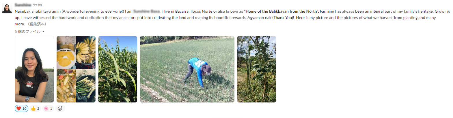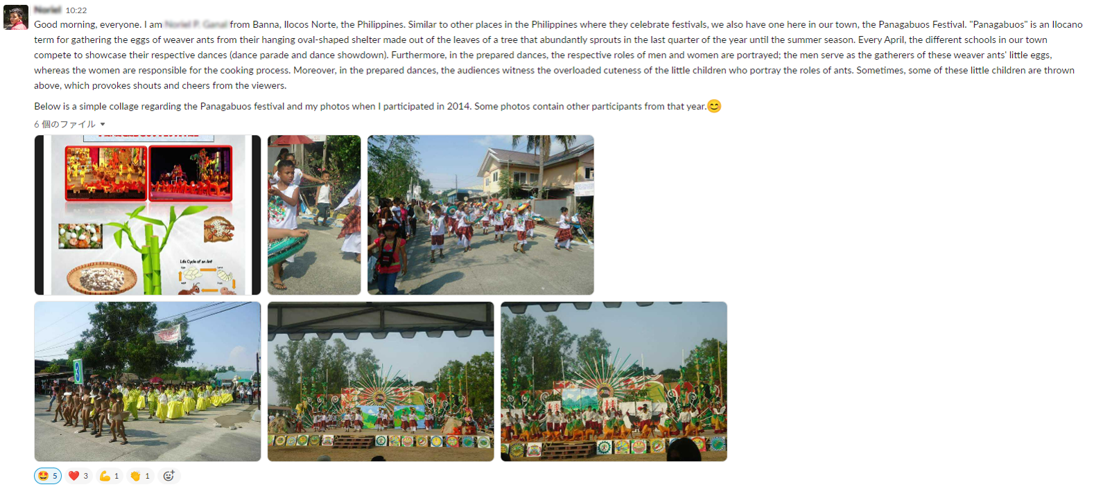 As cross-group activities, the students also enjoyed interacting with each other by introducing photos on Slack.