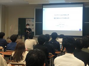 プログラム最終後継続事業として、講演会を実施しました。講師には、西日本イノベーション戦略室 オープンイノベーションデザイナーの下川哲平氏、共同参画機関であった株式会社インディージャパンの津嶋辰郎氏にご講演いただきました。今回は感染対策をとりながらの、対面で開催しました。