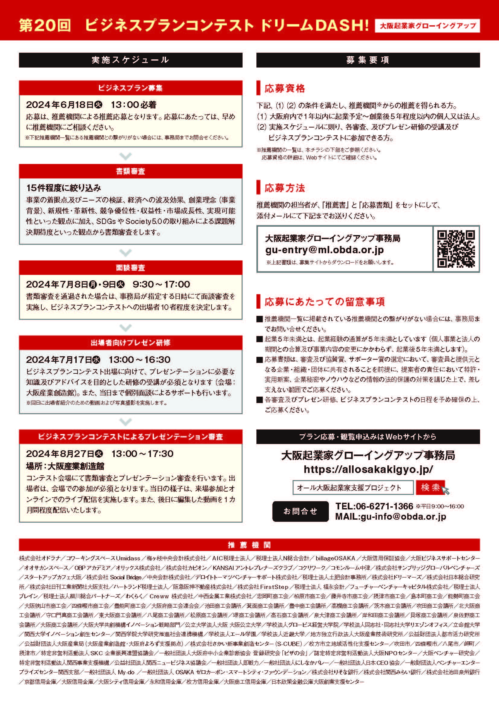 下記(1)(2)の条件をみたし、推薦機関からの推薦を得られる方 (1)大阪府下で1年以内に起業予定~創業後5年程度以内の個人又は法人。 (2)実施スケジュールに則り、各審査、及びプレゼン研修の受講及びビジネスプランコンテストに参加 できる方。 ※推薦機関の一覧は、チラシの下部をご参照ください。 応募資格の詳細は、Webサイトにてご確認ください。 |