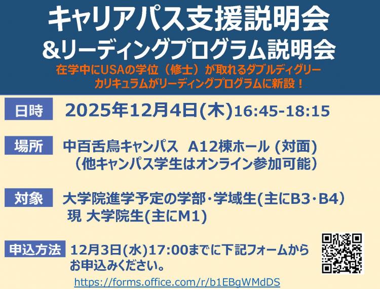 12月4日開催【大学院生・進学予定者・教員対象】キャリアパス支援説明会&リーディングプログラム説明会の開催