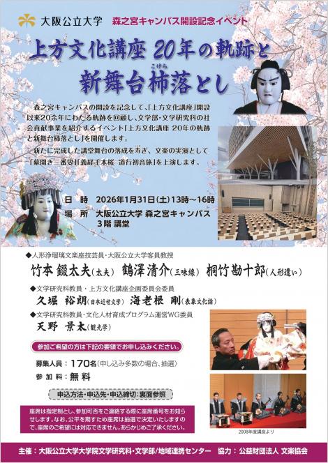 森之宮キャンパスの開設を記念して、「上方文化講座」開設以来20余年にわたる軌跡を回顧し、文学部・文学研究科の社会貢献事業を紹介するイベント「上方文化講座 20年の軌跡と新舞台杮(こけら)落とし」を開催します。