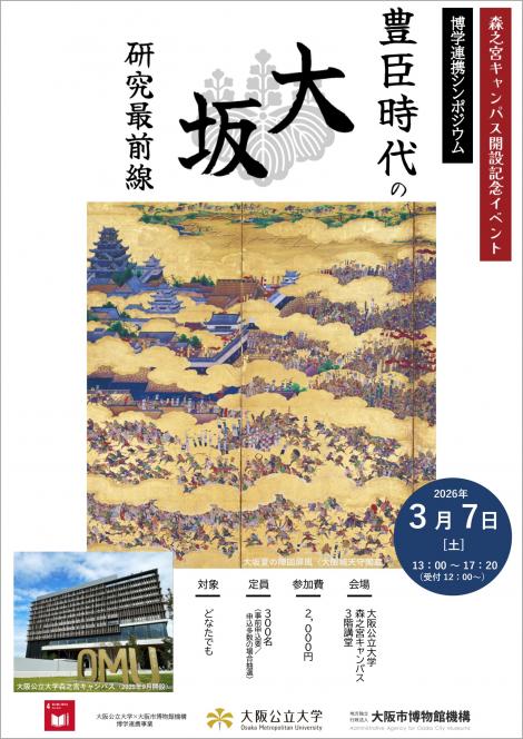 本シンポジウムでは、2026年のNHK大河ドラマ「豊臣兄弟!」を契機として注目を集める、豊臣大坂城と城下町について最新の学術的研究の成果を紹介します。森之宮に新キャンパスを開設した大阪公立大学と大阪市博物館機構との連携で、今後どのような新しい研究がなされるのか、可能性と課題についても意見を交わします。