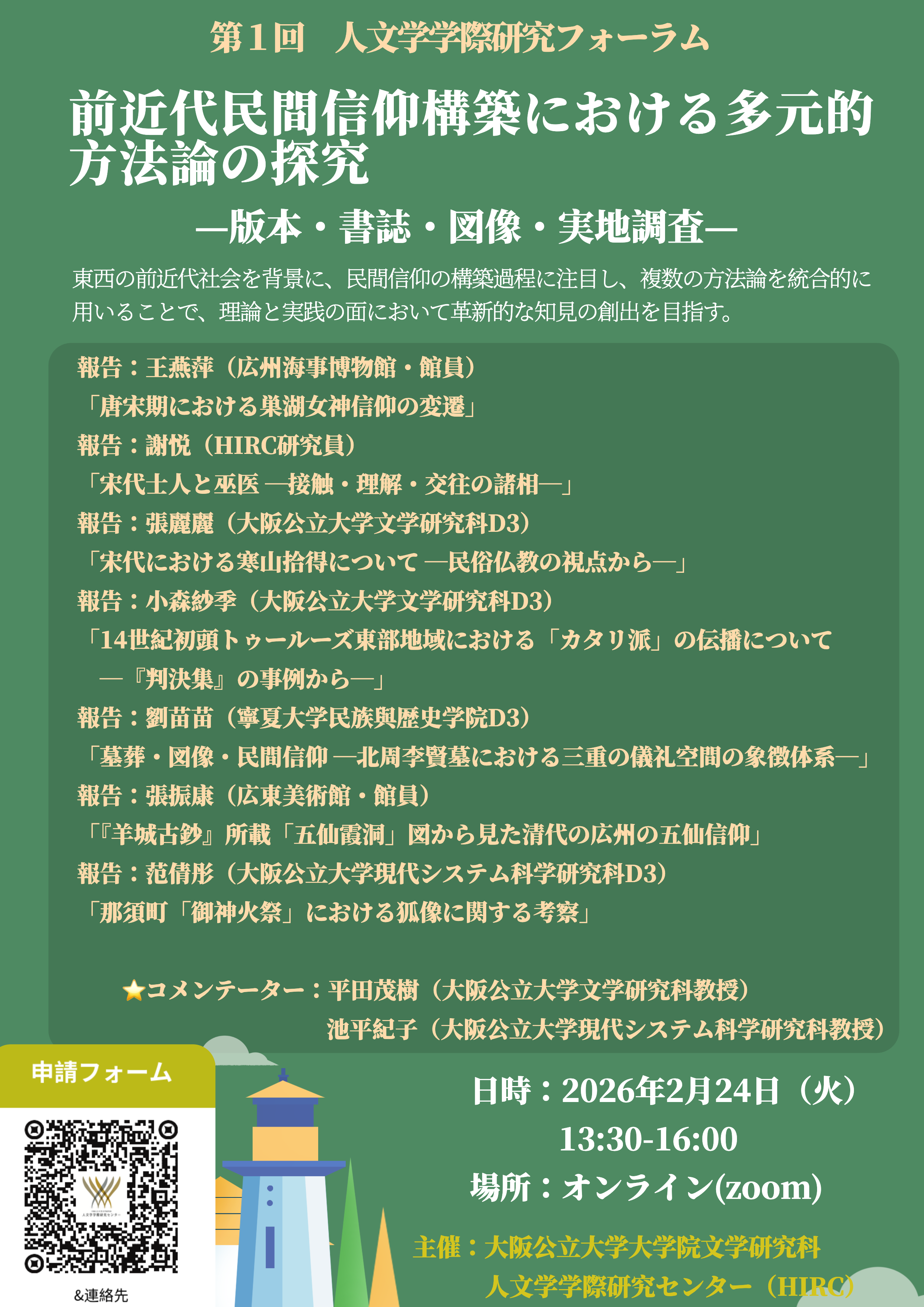 【プログラム】 ・ 報告:王燕萍(広州海事博物館・館員) 「唐宋期における巣湖女神信仰の変遷」 ・ 報告:謝悦(HIRC研究員) 「宋代士人と巫医一接触・理解・交往の諸相一」 ・ 報告:張麗麗(大阪公立大学文学研究科D3) 「宋代における寒山拾得について一民俗仏教の視点から一」 ・ 報告:小森紗季(大阪公立大学文学研究科D3) 「14世紀初頭トゥールーズ東部地域における「カタリ派」の伝播について一『判決集』の事例から一」 ・ 報告:劉苗苗(寧夏大学民族與歴史学院D3) 「墓葬・図像・民間信仰一北周李賢墓における三重の儀礼空間の象徴体系一」 ・ 報告:張振康(広東美術館・館員) 「『羊城古鈔』所載「五仙霞洞」図から見た清代の広州の五仙信仰」 ・ 報告:范倩彤(大阪公立大学現代システム科学研究科D3) 「那須町「御神火祭」における狐像に関する考察」 ・ コメンテーター:平田茂樹(大阪公立大学文学研究科教授) 池平紀子(大阪公立大学現代システム科学研究科教授)