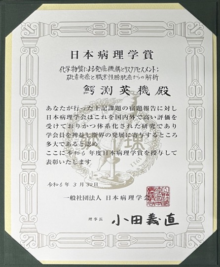 この度は、長年行ってきました化学物質による発癌機構とリスクアセスメントにおいて栄誉ある日本病理学会 日本病理学賞を頂き、誠に光栄に思います。