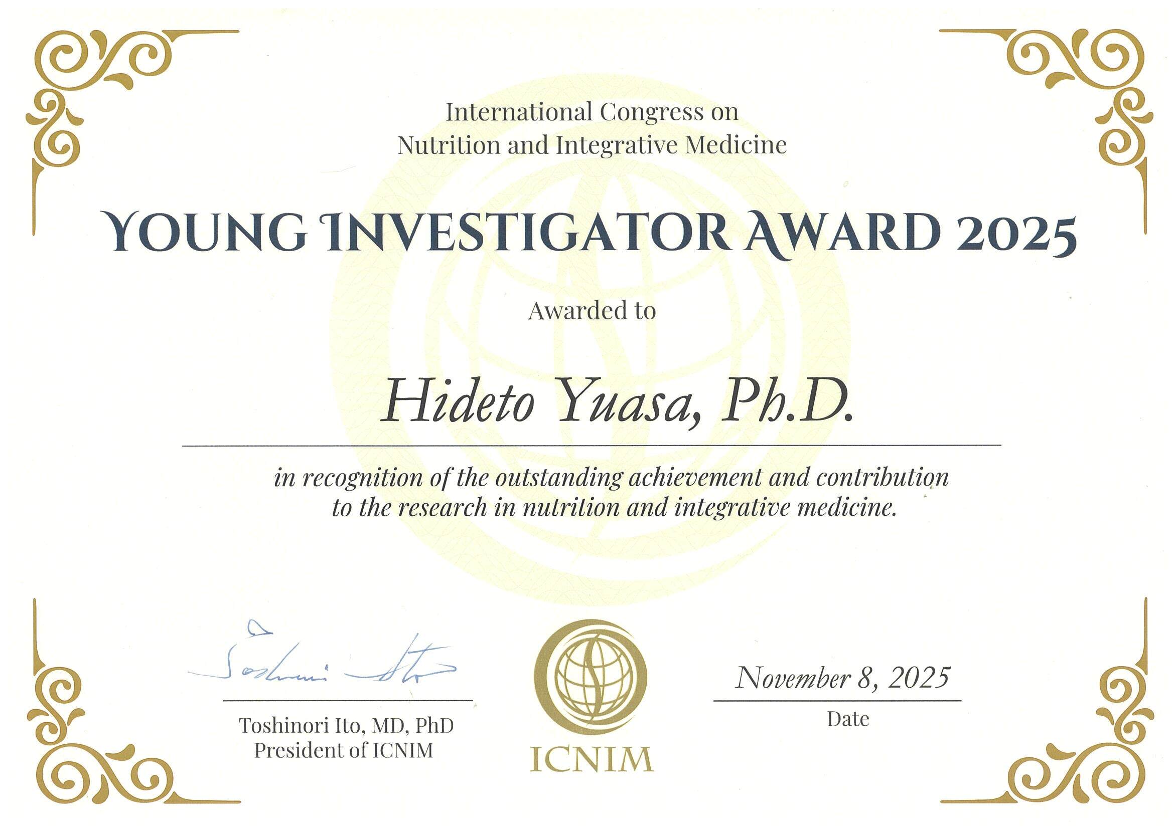 機能細胞形態学の湯浅 秀人 助教が、The 33rdAnnual Meeting of International Congress on Nutrition and Integrative Medicine(ICNIM2025)にてYOUNG INVESTIGATOR AWARD 2025を受賞しました。