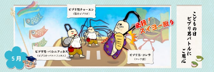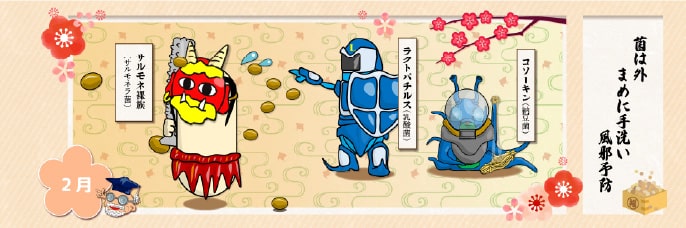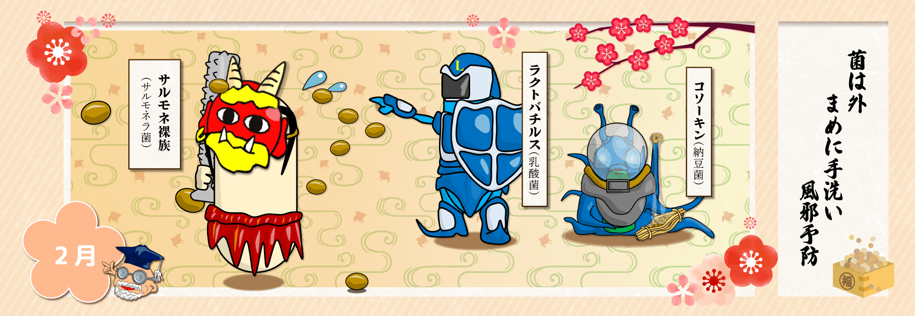 今月は節分、豆まきがありますね。「鬼は外」ならぬ「菌は外」、ということで、「豆まき」ではなく「まめにうがい・手洗い」をしてバイキンを退治するというお話です。